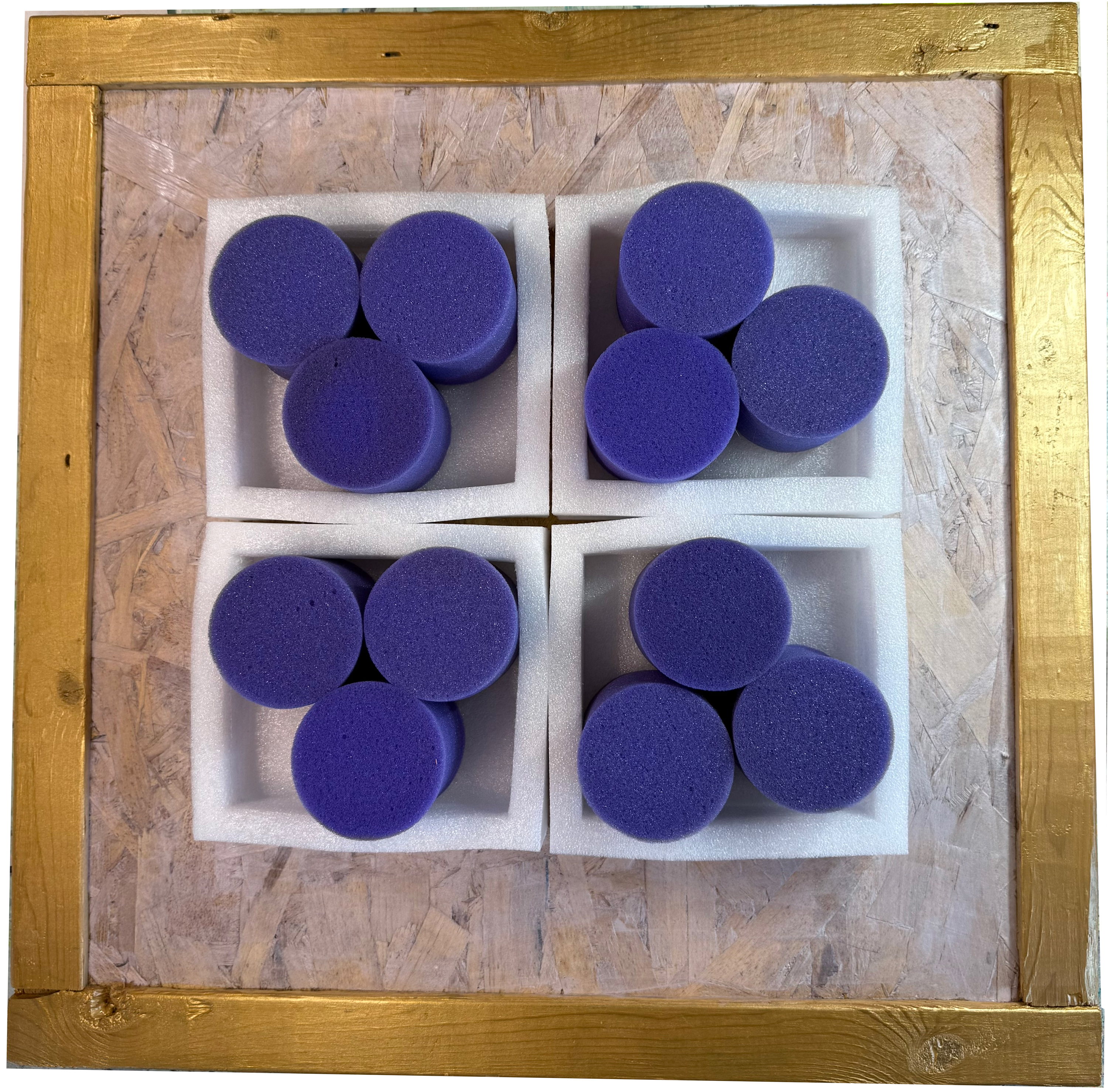 #898 mixed media artwork using found objects including foam purple cylinders